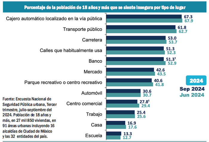 En 2019 se sentían inseguros en cajeros automáticos el 80.9 por ciento de los usuarios, mientras que en 2024 esta percepción bajó al 67.3 por ciento. El segundo lugar en donde se siente más insegura la gente es en el transporte público. También hay una disminución en la percepción de los usuarios del 73.2 por ciento en 2019 al 61.8 por ciento en el 2024. La percepción de inseguridad disminuyó en prácticamente todos los espacios públicos en los últimos seis años.