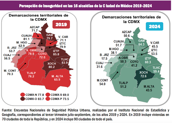También es muy significativa la caída en la percepción de inseguridad en las 16 alcaldías de la Ciudad de México.