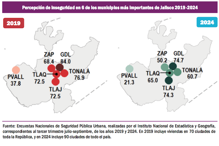 En el caso de Jalisco, en la zona metropolitana de Guadalajara, el municipio con el más alto índice de percepción de inseguridad en 2019 era la capital tapatía, con 84 por ciento, y para 2024 registra una percepción de inseguridad del 74.7, una baja de 9.3 por ciento en seis años. Mientras que el municipio con más baja percepción de inseguridad en Jalisco en 2019 era Puerto Vallarta, con un 37.8 por ciento, y en 2024 registra 21.3 por ciento de tasa de percepción de inseguridad, una baja del 16.5 por ciento en los más recientes seis años.