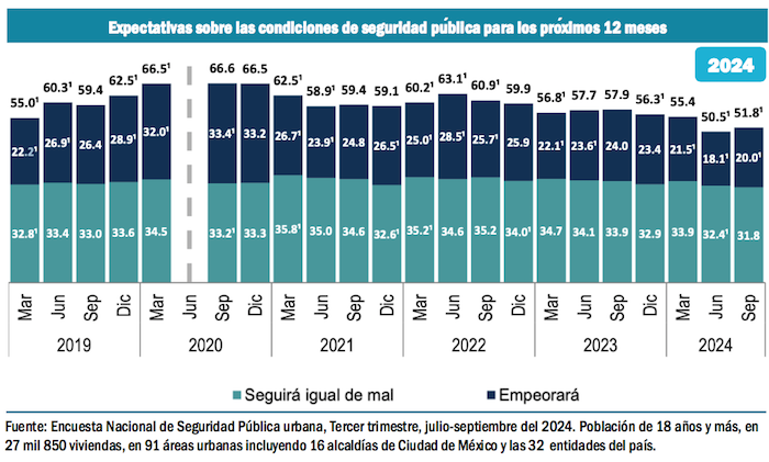 Las dos encuestas nacionales de Seguridad Pública Urbana corresponden al tercer trimestre, julio-septiembre, de 2019 y 2024, respectivamente.