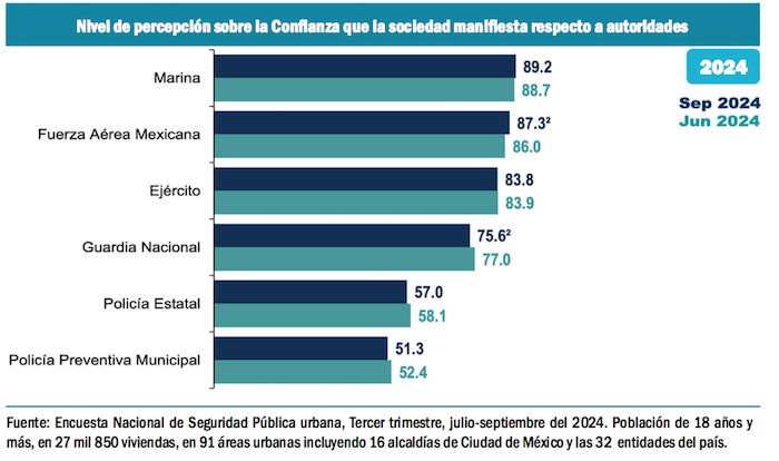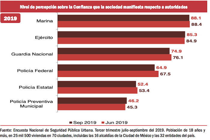 Con respecto a las instituciones de seguridad que despiertan más confianza entre la gente común, los indicadores prácticamente no se han modificado en los más recientes seis años: la Marina, el Ejército y la Guardia Nacional siguen en primer lugar en la preferencia de la población.
