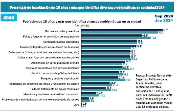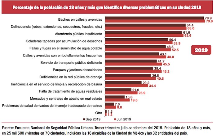 Mientras que en relación con los principales servicios que la gente sigue reclamando, continúan en los primeros lugares los problemas de los baches, de las deficiencias en el suministro de agua potable y la falta de alumbrado público.