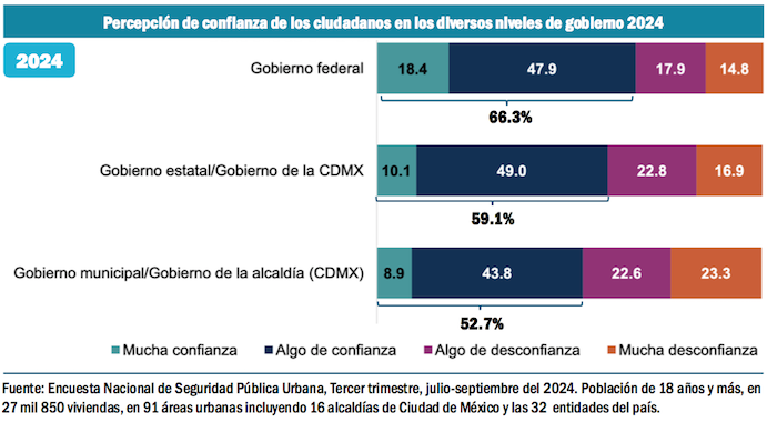 Finalmente, es el gobierno federal el que despierta mayor confianza entre la población; en segundo lugar están los gobiernos estatales y hasta el final, la tercera autoridad en la que confían los ciudadanos es en sus gobiernos municipales.