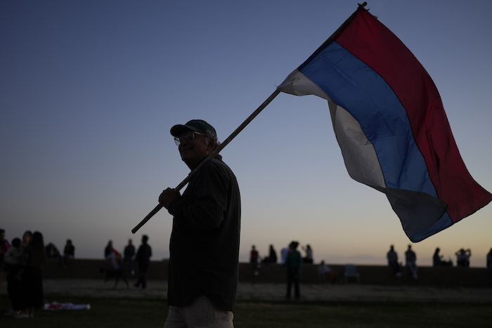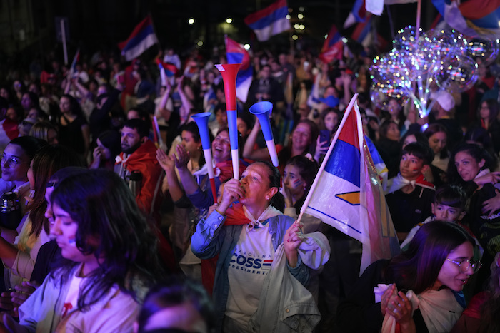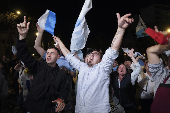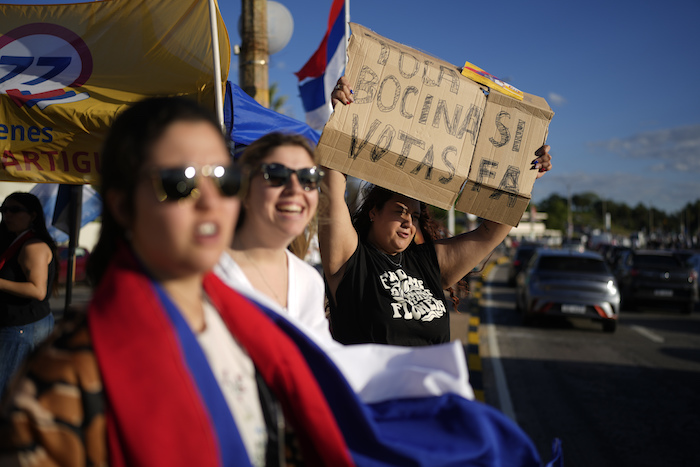 Seguidores del oficialisa Partido Nacional, tras el cierre de centros de votación en Montevideo, Uruguay, el domingo 27 de octubre de 2024. Foto: Matilde Campodonico, AP.