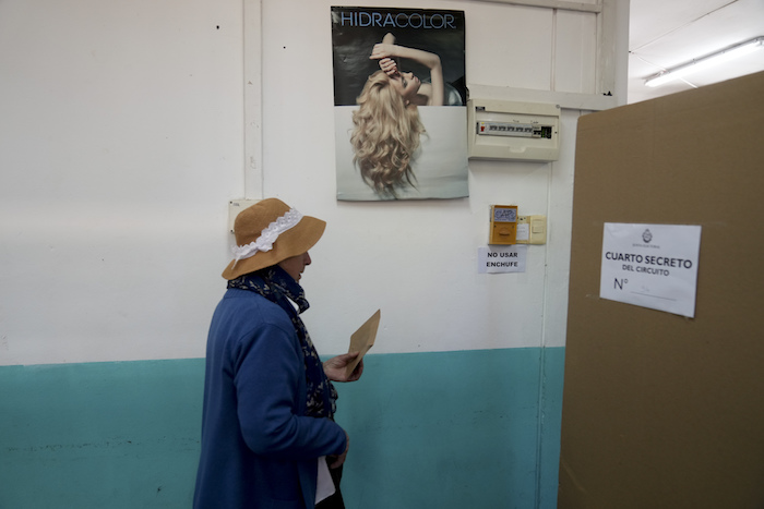 Una mujer espera su turno para votar durante las elecciones generales en Canelones. Foto: Matilde Campodónico, AP.