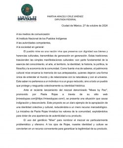 "El uso del gentilicio 'Mixe' para nombrar al mezcal es particularmente problemático y ofensivo. A los ojos de Rojas, nuestra identidad y cultura se convierte en un recurso conveniente para garantizar la legitimidad de su producto," se lee en un comunicado.
