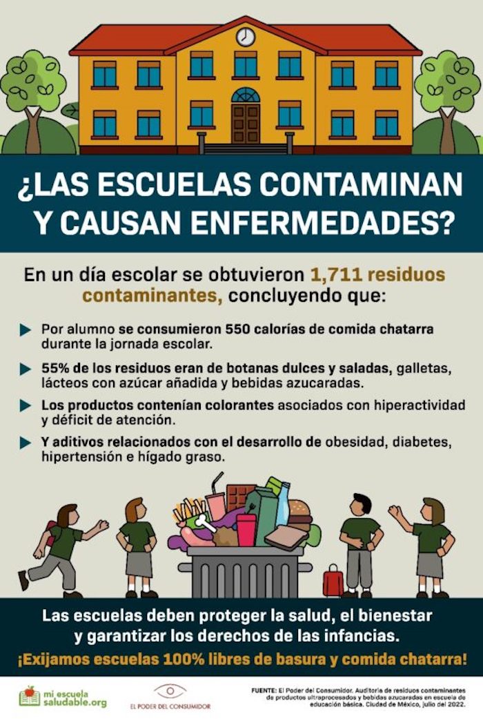 Una auditoría realizada en 2020 por la organización El Poder del Consumidor –una de las promotoras del etiquetado frontal de advertencia de alimentos– estima que sólo en un día de escuela las y los estudiantes consumen, en promedio, 550 calorías extras provenientes de productos chatarra.