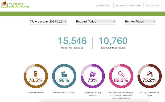 Datos de la iniciativa Mi Escuela Saludable muestran que en el ciclo escolar 2023-2014, en 98 por ciento de 10 mil 760 escuelas monitoreadas a nivel nacional aún se vende comida chatarra, en 73 por ciento de ellas no venden frutas y verduras, mientras que en 75 por ciento no hay bebederos de agua.