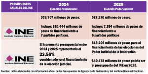 El pasado sábado se aprobó el presupuesto ordinario que el INE presentará a consideración de la Secretaría de Hacienda, que después tendría que ser aprobado por la Cámara de Diputados del Congreso de la Unión, que ascendería a 27 mil 270 millones de pesos, incluyendo 7 mil 354 millones para el financiamiento de los seis partidos políticos nacionales con registro: Morena, Partido Acción Nacional, Partido Revolucionario Institucional, Movimiento Ciudadano, Partido Verde Ecologista de México y Partido del Trabajo. Pero quedó pendiente afinar la partida especial para la realización de los comicios para la renovación del Poder Judicial de la Federación, que en un princio ha sido calculada en 13 mil 205 millones de pesos.