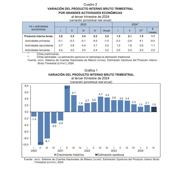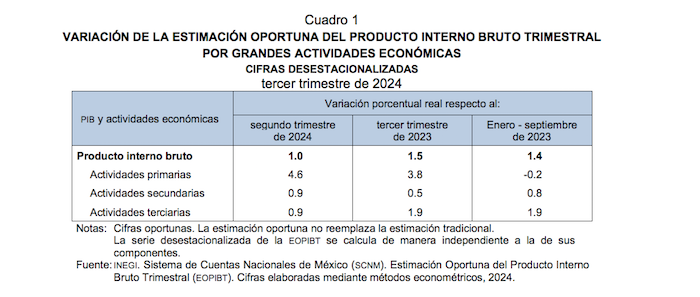 En el acumulado de los primeros nueve meses de 2024, el PIB oportuno incrementó 1.4 por ciento con respecto a igual periodo de 2023, con lo que el crecimiento de la economía en este año estaría en línea con las expectativas de especialistas del sector privado y de organismos internacionales.