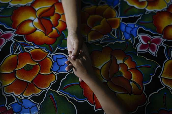 Eyla Fonseca, migrante de Venezuela, sujeta la mano de su hijo mientras desayunan en el albergue Casa del Migrante en Tecún Umán, Guatemala, el domingo 27 de octubre de 2024. Foto: Matías Delacroix, AP.