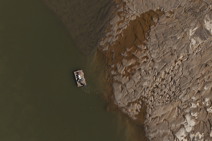 Un migrante venezolano toma una fotografía en una balsa de madera y neumáticos mientras cruzan el río Suchiate desde Tecún Umán, en Guatemala. Foto: Matías Delacroix, AP.