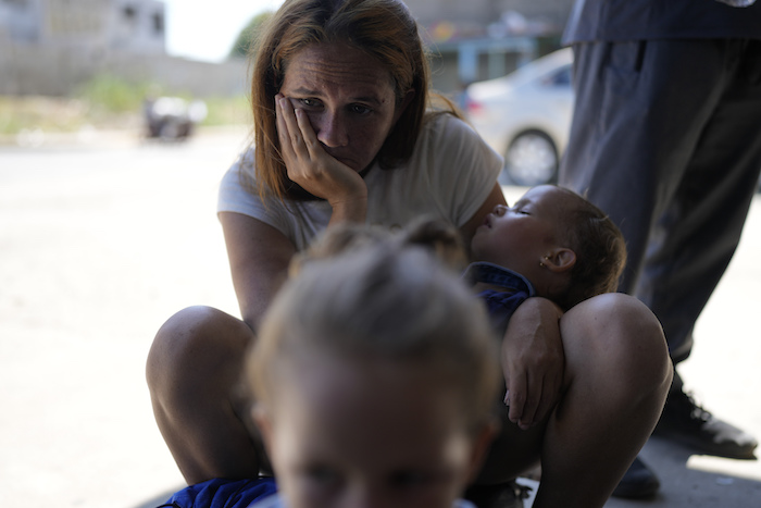 La migrante venezolana Lisbeth Contreras abraza a sus hijos mientras cruzan el río Suchiate, fronterizo entre Guatemala y México, desde Tecún Umán, Guatemala, el sábado 26 de octubre de 2024. Foto: Matías Delacroix, AP.
