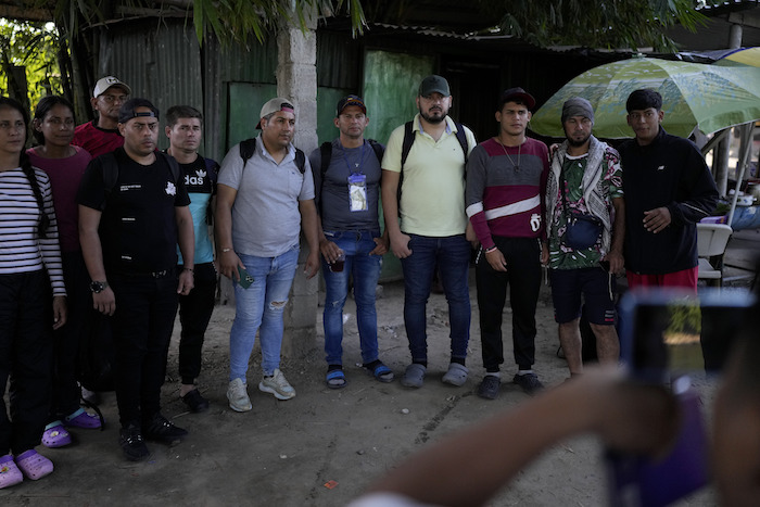 Migrantes venezolanos colocados en fila para tomarse una foto como prueba de que han pagado su pase para cruzar desde Tecún Umán, en Guatemala, a Tapachula. Foto: Matías Delacroix, AP.