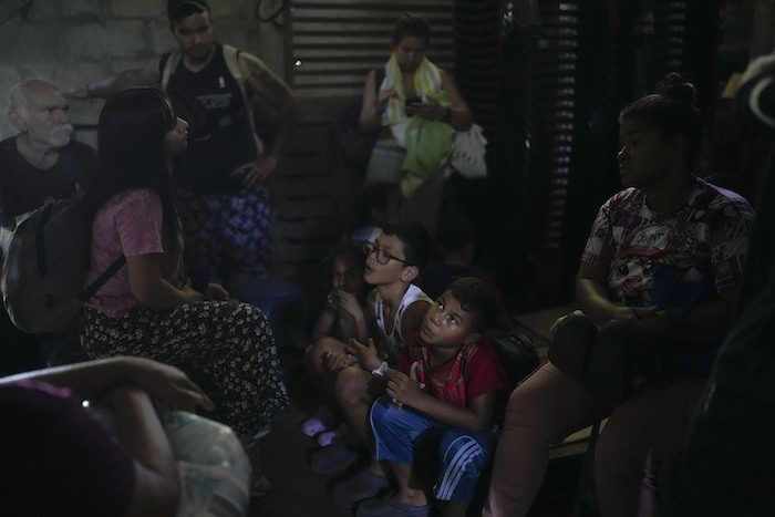 El migrante venezolano Daniel Dura, segundo por la derecha, espera junto a su madre Rannely Durán dentro de una casa antes de cruzar el río Suchiate, fronterizo entre Guatemala y México. Foto: Matías Delacroix, AP.