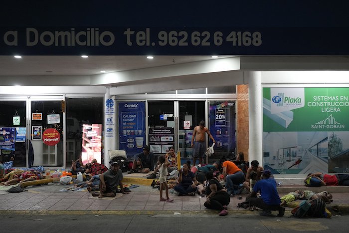 Un grupo de migrantes descansa frenta a un local de pintura en Tapachula. Foto: Matías Delacroix, AP.