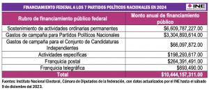 Este 2024 los partidos políticos gastarán, 10,444 millones de pesos, incluyendo 3 mil 304millones que se les entregaron, especificamente, para el financiamiento de las pasadas campañas electorales. Y para sus gastos ordinarios les fueron proporcionados 6 mil 609 millones de pesos. En 2025, cuando no hay elecciones nacionales en las que tuvieran que involucrarse los partidos políticos, dispondrán de un presupuesto de 7 mil 452 millones de pesos para sus actividades ordinarias.