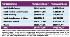 Los números pueden ser engañosos, pues a primera vista parecería que entre 2024 y 2025 hay una disminución en el financiamiento de los partidos políticos, al bajar, en global, de 10 mil 444 millones de pesos a 7 mil 452 millones, sin embargo,no hay que perder de vista que este año hubo una partida extraordinaria de más de 3 mil millones de pesos para el financiamiento de las campañas electorales.
