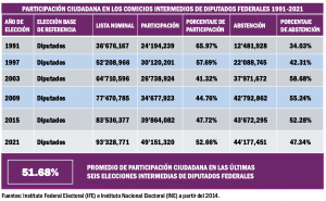 En los comicios presidenciales del pasado domingo 2 de junio del 2024 votó el 61.04 por ciento de los ciudadanos inscritos en la Lista Nominal de Electores; acudió a las urnas el 60.95 por ciento en las elecciones de senadores y emitió su sufragio el 60.54 por ciento en los comicios de Diputados Federales.
