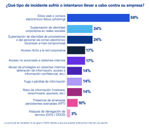 Por su parte, cuatro de cada diez organizaciones (39 por ciento) se enfrentaron a un ciberataque, donde el phishing (sitios web o correos electrónicos falsos) se perfiló como la modalidad más frecuente de este tipo de delito (59 por ciento), seguido de la suplantación de identidad corporativa en redes sociales (24 por ciento), la suplantación de identidad de proveedores o personal por correo electrónico (24 por ciento) y el acceso ilícito a la red corporativa (17 por ciento).