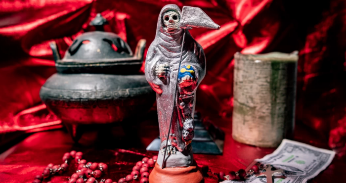 Ataviada con un hábito de monja negro y sosteniendo una guadaña en una mano, la Santa Muerte atrae a personas que buscan todo tipo de ayuda sobrenatural: desde repeler el mal y llevar a cabo venganzas hasta evitar que sus parejas sean infieles y conseguir mejores empleos.