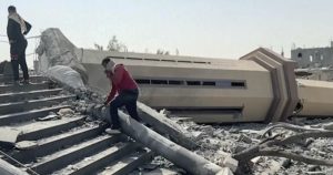 La gente observa una mezquita destruida por los ataques aéreos israelíes al sur de Gaza. Foto: AP