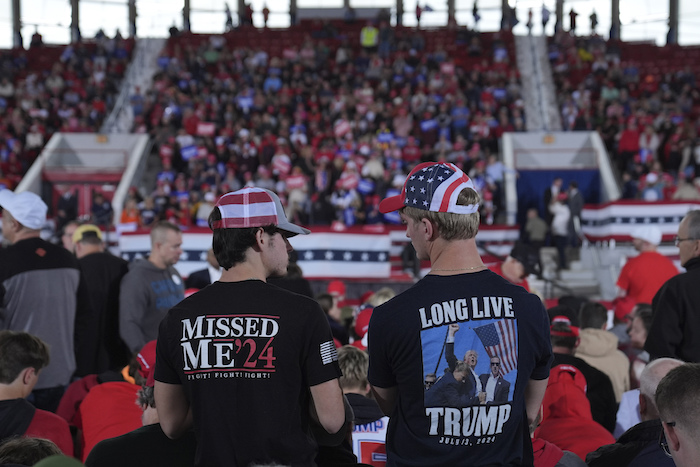 Simpatizantes llegan al estadio donde el candidato presidencial republicano Donald Trump hará un acto de campaña en el J.S. Dorton Arena, el lunes 4 de noviembre de 2024. Foto: Evan Vucci, AP.