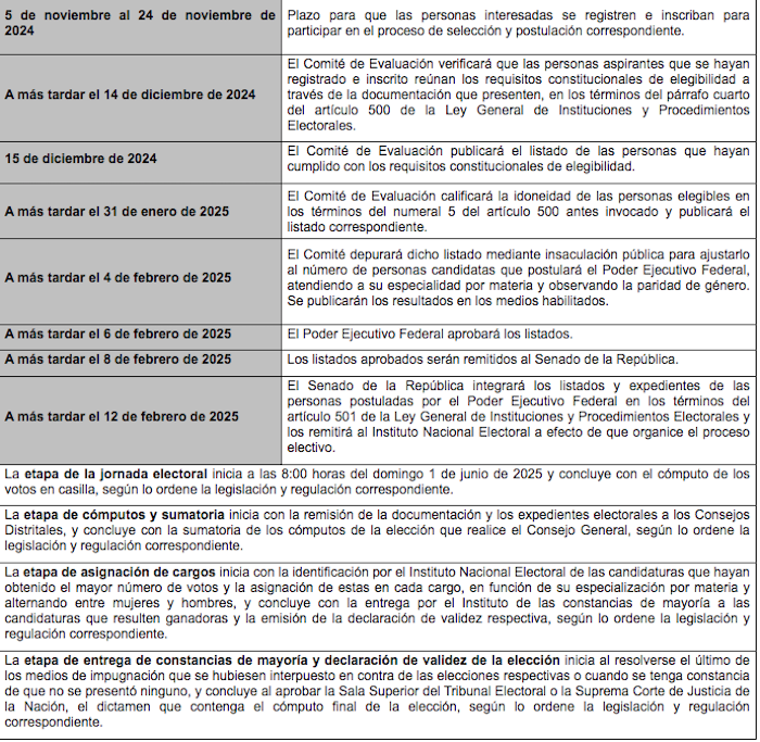 Las fechas y plazos del proceso de elección de personas juzgadoras para el presente proceso electoral serán las siguientes: