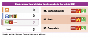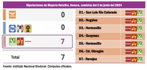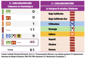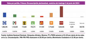 Morena, PT y PVEM sumaron el 51.63 por ciento de los votos en la 1a. Circunscripción. PAN-PRI-PRD alcanzaron el 28.96 por ciento y Movimiento Ciudadano el 15.96 por ciento.