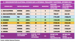 Ciudad de México, 5 de noviembre (SinEmbargo).- Morena y sus aliados del Partido del Trabajo y del Partido Verde Ecologista de México tienen una presencia dominante en por lo menos siete de los ocho estados que integran la Primera Circunscripción Electoral, territorio en el que se votará por Magistrados de Circuito y por lo menos 50 jueces de distrito, en los comicios del domingo primero de junio del 2025.