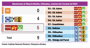 De los ocho estados de la Primera Circunscripción, el más competido fue Chihauhua, donde la oposición PAN-PRI-PRD logró arebatarle a Morena y sus aliados cuatro de nueve distritos electorales. Situación que podría reflejarse en los comicios del Poder Judicial, cuando deban elegirse titulares para los Tribunales Colegiados de Circuito y Tribunales Colegiados de Apelación, así como los nuevos responsables de los Juzgados de Distrito del Poder Judicial de la Federación.