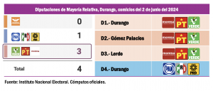 Durango, un estado de la Rrepública que está en manos del PRI, tiene cuatro distritos electorales, de los cuales tres quedaron fueron ganados por candidatos de Morena-PT-PVEM y sólo una posición fue para la alianza opositora Fuerza y Corazón por México, encabezada por el PAN.