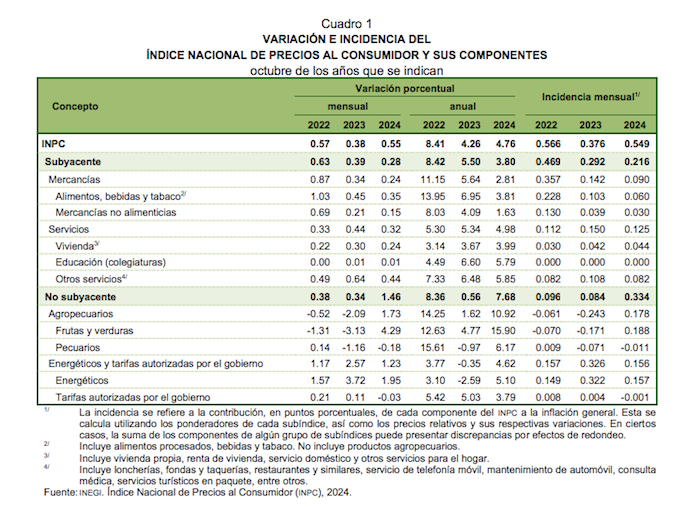 Los datos oficiales publicados este jueves por el Instituto Nacional de Estadística y Geografía (Inegi) mostraron que el Índice Nacional de Precios al Consumidor (INPC) reportó un crecimiento de 0.55 por ciento en octubre comparación con el mes anterior, por lo que la inflación general anual se ubicó en 4.76 por ciento.
