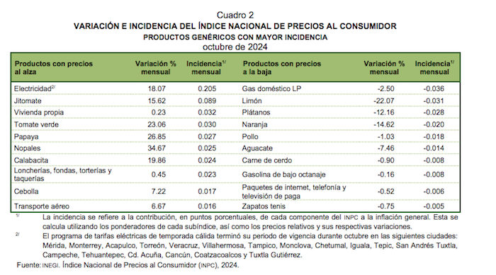 Durante el mes de octubre, los productos que tuvieron mayor alza y llevaron a que la inflación subiera fueron: nopales, papaya, tomate verde, calabacita y jitomate.