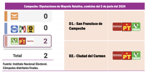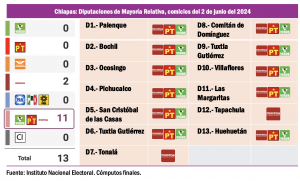 Tres estados ilustran la aplastante e influyente presencia de Morena y sus aliados en la región Sur Sureste: en Campeche, la coalición Sigamos Haciendo Historia ganó dos de dos distritos electorales federales; en Chiapas, la coalición oficialista arrasó con los 13 triunfos posibles, mientras que en Oaxaca los 10 distritos fueron para Morena-PT y PVEM. Por otra vertiente, podemos observar que en estos tres estados que domina plenamente Morena, también hay 29 Distritos Judiciales, la mitad de los cuales se renovarán en junio del 2025.