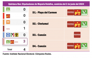 La presencia dominante de Morena y sus aliados PT y PVEM se extiende por otros dos estados de la Tercera Circunscripción: Quintana Roo y Tabasco, entidades en las cuales la coalición Sigamos Haciendo Historia se llevó la victoria en los diez distritos electorales de Mayoría Relativa en junio del 2024. Habría que considerar que en esta dos entidades hay otros 24 Distritos Judiciales de los cuales la mitad de sus titulares se renovarán el año próximo en los comicios judiciales. No existe ninguna posibilidad real de que la presencia de la oposición pueda tener alguna influencia en la elección de Ministros, Magistrados y Jueces de Distrito en estas dos entidades.