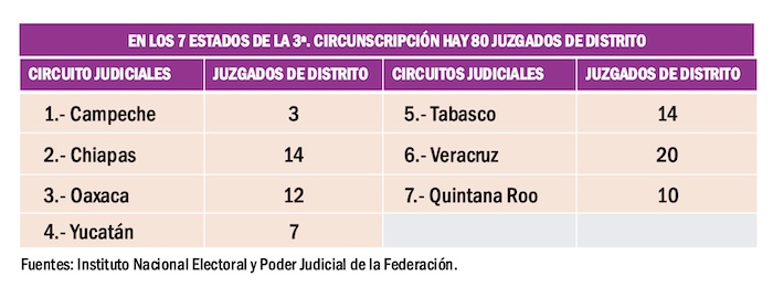 En el país hay 32 Circuito Judiciales, uno por cada una de las 32 entidades de la República. El Circuito Judicial de Campeche tiene 3 juzgados de distrito; Chiapas tiene 14 distritos judiciales; Oaxaca 12; Yucatán 7; Tabasco 14; Veracruz 20 y 10 distritos judiciales más están en Quintana Roo. En total, la Tercera Circunscripción Electoral suma 80 Distritos Judiciales, la mitad de los cuales serán renovados en los comicios del domingo primero de junio del 2025.