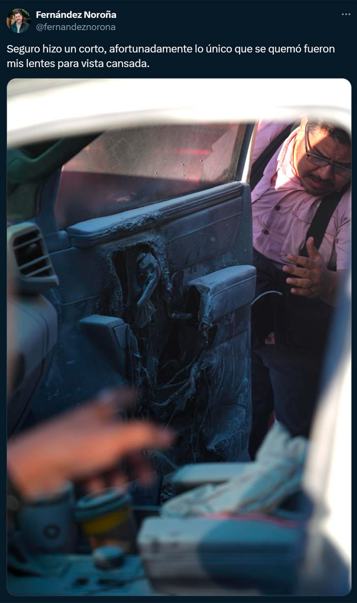En otro par de publicaciones, Noroña compartió dos fotografías en la que se ve cómo el interior de la puerta del copiloto terminó derretida a causa del incendio. De acuerdo con el legislador, lo único que se quemó fueron unos lentes "para vista cansada" que guardaba en esa arte del vehículo.