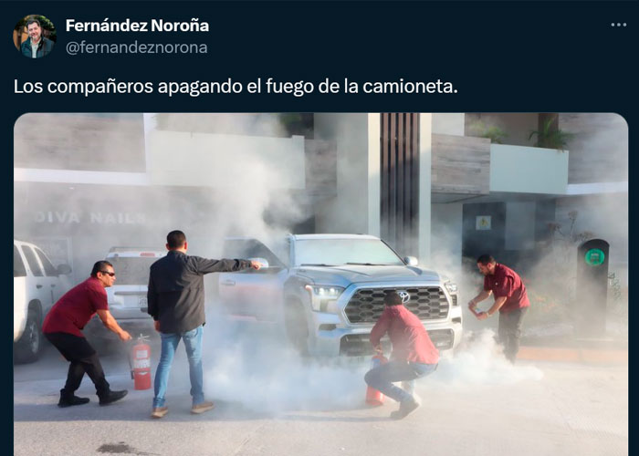 Noroña también compartió una fotografía que tomó al momento en el que personas con las que viajaba estaban apagando el incendio al interior de la camioneta con ayuda de extintores.