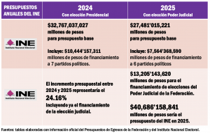 Ciudad de México, 11 de noviembre (SinEmbargo).- El Instituto Nacional Electoral fijó finalmente en más de 40 mil millones de pesos su proyecto de presupuesto de egresos para el 2025, que incluye una partida especial de más de 13 mil millones para realizar la contienda de 881 candidatos que buscarán cargos en el Poder Judicial de la Federación en los comicios del domingo primero de junio del 2025, cuando se votará por ministros, magistrados y jueces de distrito.