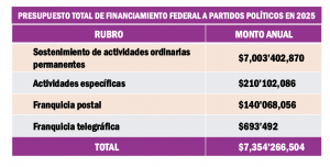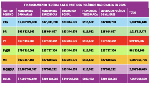 Las cantidades que los partidos políticos recibirán como financiamiento en el 2025 se impresionantes: Morena, por ejemplo, dispondrá de 2 mil 658 millones de pesos y el partido de ingresos más modestos será el Partido del Trabajo, con 699 millones de pesos.