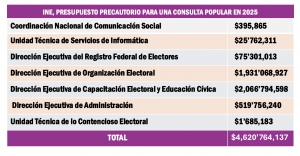 Por acuerdo del Consejo General del Instituto Nacional Electoral se aprobó el pasado lunes 4 de noviembre del 2024, el presupuesto presupuesto precautorio para la eventual organización de una Consulta Popular para el ejercicio fiscal 2025, por un monto total de $4,620,764,137.00 (cuatro mil seiscientos veinte millones setecientos sesenta y cuatro mil ciento treinta y siete pesos 00/100 M.N.), el cual formará parte del anteproyecto de Presupuesto del Instituto Nacional Electoral para el ejercicio fiscal 2025.