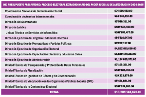 El lunes 4 de noviembre del 2024, por acuerdo del Consejo General del Instituto Nacional Electoral se aprobó el presupuesto precautorio para el Proceso Electoral Extraordinario del Poder Judicial de la Federación 2024-2025, para el ejercicio fiscal 2025, por un monto total de $13,205’143,620.00 (trece mil doscientos cinco millones ciento cuarenta y tres mil seiscientos veinte pesos 00/100 M.N.), el cual formará parte del anteproyecto de Presupuesto del Instituto Nacional Electoral para el ejercicio fiscal 2025.