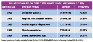 La caída electoral del PAN llegó a su punto más bajo en 2024, cuando su candidata Bertha Xóchitl Gálvez Ruiz sólo le sumó al partido albiazul una votación que le representó el 16.04 por ciento de los sufragios captados en las urnas.