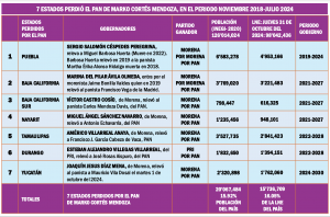 Los números son fríos y duros, para dimensionar la historia de Marko Antonio Cortés Mendoza, quien llegó a la presidencia del PAN en noviembre del 2018, cuando su partido tenía todavía 11 gubernaturas. En los recientes seis años perdió siete: Puebla, Baja California, Baja California Sur, Nayarit, Tamaulipas, Durango y Yucatán. Sólo conservó Aguascalientes, Guanajuato, Querétaro y Chihuahua. La última desgracia para el partido albiazul se concretó apenas el pasado domingo 2 de junio del 2024, cuando el morenista Joaquín Jesús Díaz Mena derrotó al panista Renán Barrera Concha, y relevó en la gubertnatura de Yucatán al albiazul a Mauricio Vila Dosal, el martes 1 de octubre del 2024.