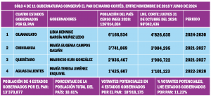 En los últimos seis años el Partido Acción Nacional ha dejado de gobernar a más de 20 millones de personas y actualmente sólo administra los destinos de 13 millones de habitantes en las cuatro entidades donde todavía conserva el poder.