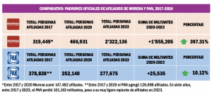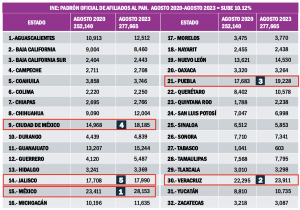 El registro más puntual del fracaso del PAN es su Padrón de Militantes, pues en siete años, entre 2017 y 2023, el albiazul perdió 101,163 afiliados, pese a su muy ligero repunte en 2023, según registros oficiales del Instituto Nacional Electoral. En el registro de la mebresía panista hay casos verdaderamente dramáticos como su militancia oficial en Tabasco, que apenas llega a 603 personas. En Guanajuato, una entikdad que gobierna desde hace 33 años, su militancia oficial llega apenas los 15 mil 244 afiliados.