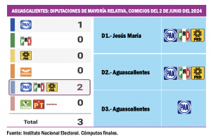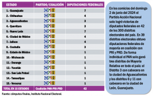 En los comicios del domingo 2 de junio del 2024 el Partido Acción Nacional solo logró victorias de diputados federales en 42 de los 300 distritos electorales del país. En 39 distritos electorales obtuvo diputaciones federales de mayoría en coalición con PRI y PRD. De forma individual el PAN solo ganó tres distritos de Mayoría Relativa en todo el país: el Distrito 3 con cabecera en la ciudad de Aguascalientes y los distritos 6 y 11 con cabecera en la ciudad de León, Guanajuato. El PAN sólo ganó distritos electorales de mayoría relativa, con sus aliados o de manera individual, en 15 de los 32 estados del país.
