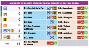 En Guanajuato, entidad que gobierna desde 1991, por más de tres décadas, el PAN ya muestra agotamiento, pues de siete victorias de Mayoría Relativa que logró, cinco fueron con el respaldo de los votos de PRI y PRD, y únicamente ganó por separado dos de los tres distritos federales que tienen cabecera en León, una de las ciudades más conservadores del estado y de toda la región de El Bajío. Pese a que perdió ocho distritos electorales federales, al PAN todavía le alcanzó para conjservar la gubernatura con su candidata Libia Dennise García Muñoz Ledo.