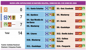 Solo hubo otra entidad del país en donde el PAN, con la ayuda sus amigos de PRI y PRD logró siete victorias: Nuevo León, donde se repartió igual número de triunfos de diputaciones de Mayoría Relativa con la coalición Sigamos Haciendo Historia encabeza por Morena. En Nuevo León el PAN también rescató una importante victoria, al ganar su candidato Adrián de la Garza Santos la presidencia municipal de la capital estatal, Monterrey, en una contienda en la cual derrotó a la candidata de Movimiento Ciudadano, Mariana Rodríguez, esposa del gobernador, Samuel Alejandro García Sepúlveda, quien llegó a ese cargo postulado por el partido naranja.